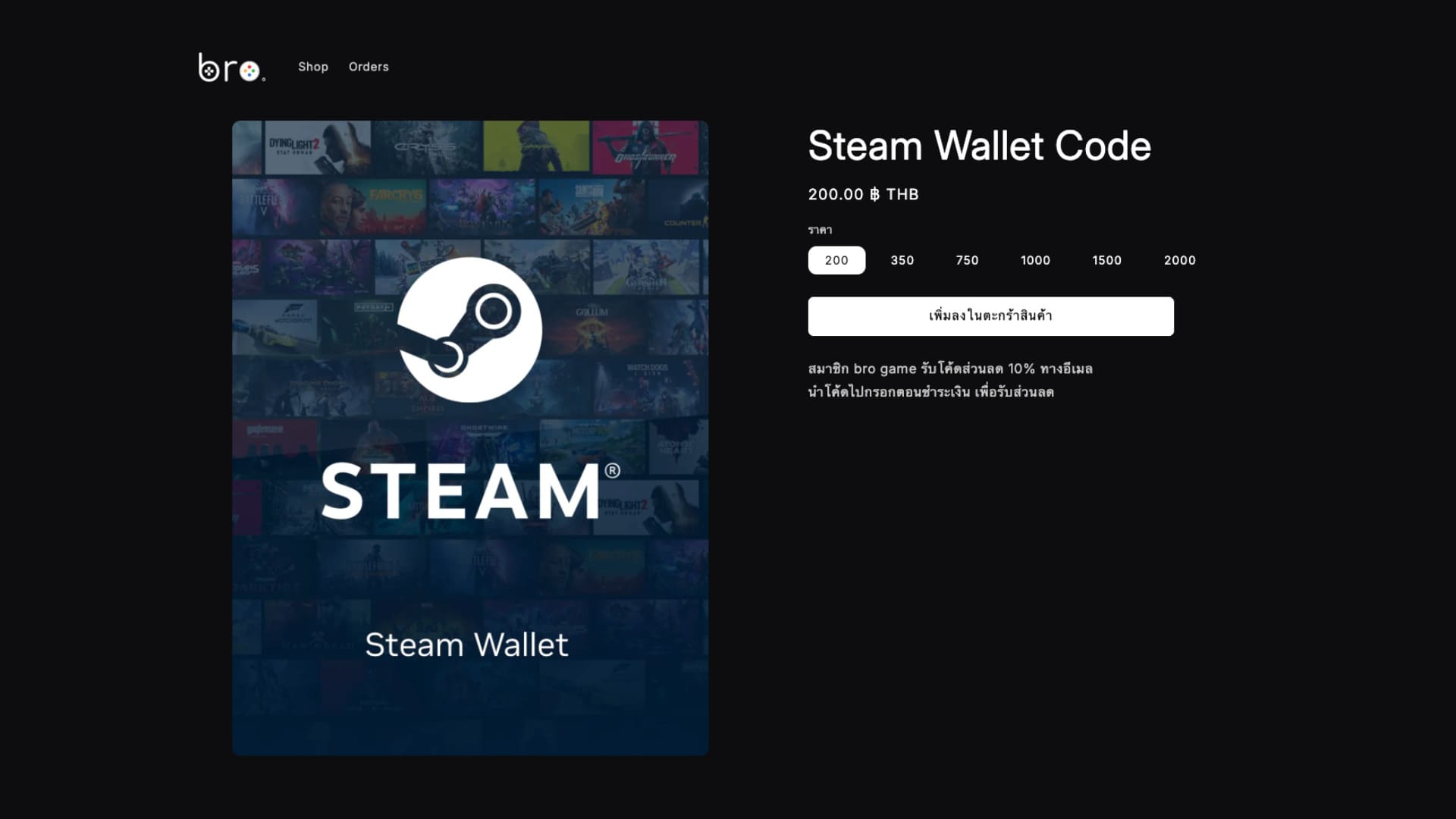 สำหรับเติม Steam Wallet เพื่อซื้อเกมบน Steam มีให้เลือก 6 ราคา คือ 200, 350, 750, 1000, 1500 และ 2000 บาท